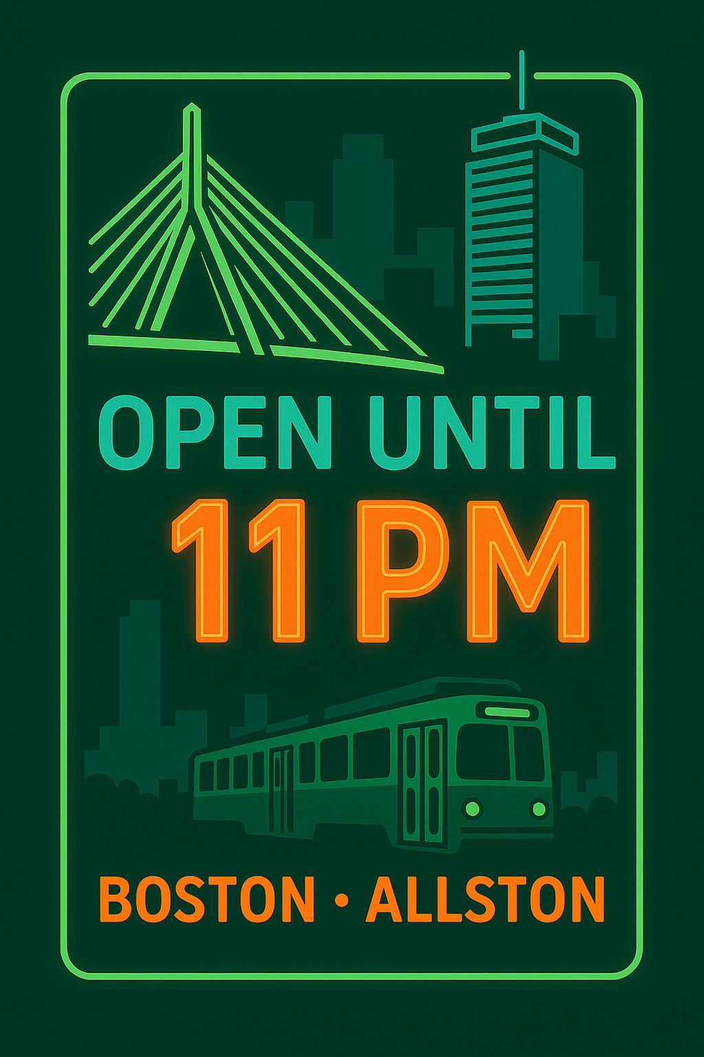 Most Boston shops close before midnight. Prolific is open late to 11 PM, which is one of the latest hours in Allston. Confirm today’s schedule on Hours..